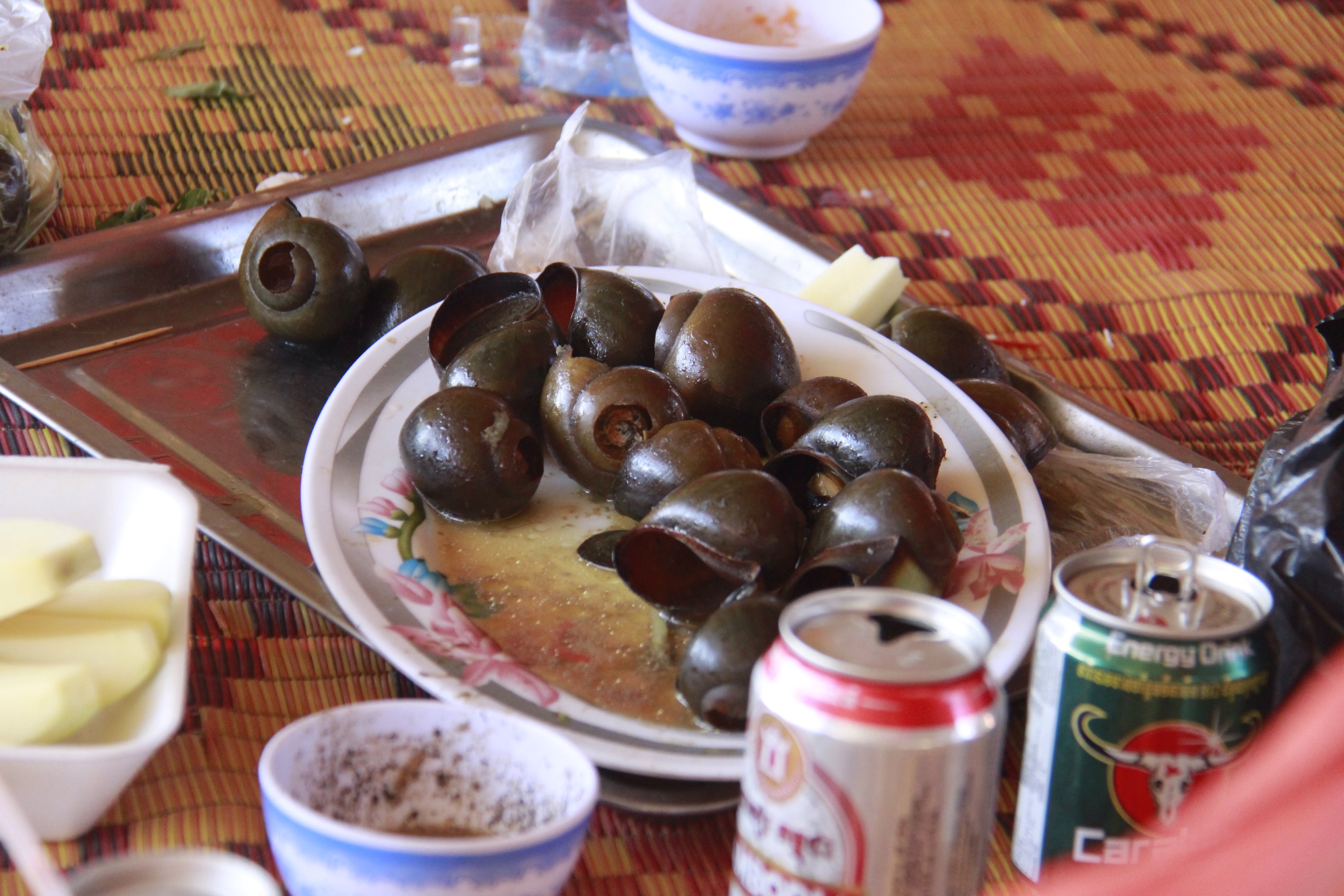 I finally had my scooter ride in Kratie, direction the pier. We stopped on the way in a strange place where everybody was chilling, drinking and eating and we have been offered to taste these huge water snails by a group of Cambodian guys. It was probably the worst thing I’ve ever put in my mouth. The smell, the texture, the size, everything was wrong in it and I decided to spit every out in the sea. I know it was really rude and gross and I usually try to taste everything people offer to me but it was just impossible to swallow that disgusting and horrible thing without throwing up.