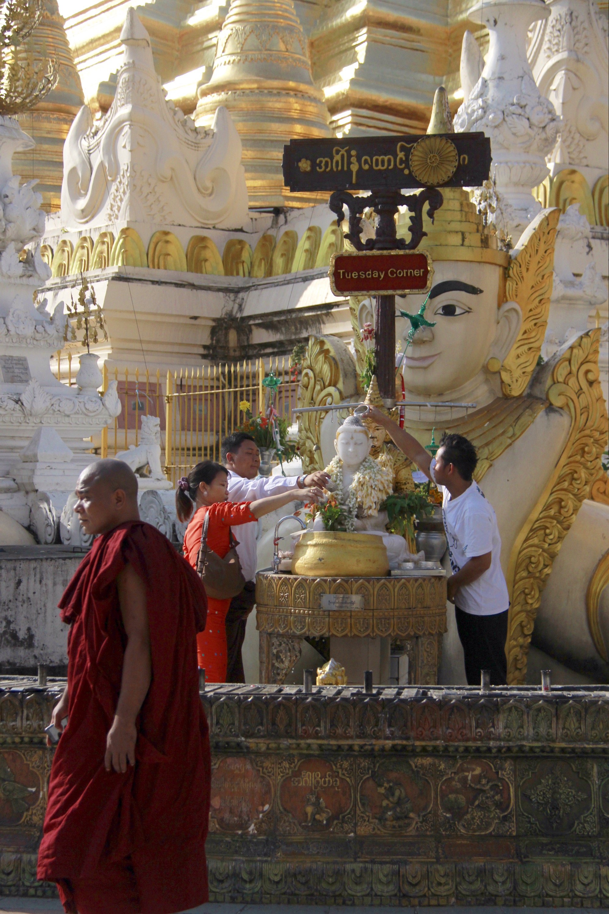 Around the big pagoda, a range of little temples and statues are dedicated to each day’s of the week. You can take a goblet, fill it with water and wash the buddha representing the day of your birth. The tradition is to drop on the statue as much goblets of water as the number of years you are to wash your life of bad energies and one more, for the year to come. Twenty nine goblets later, I let the place to others prayers and I went back to my hotel, feeling really really really pure.