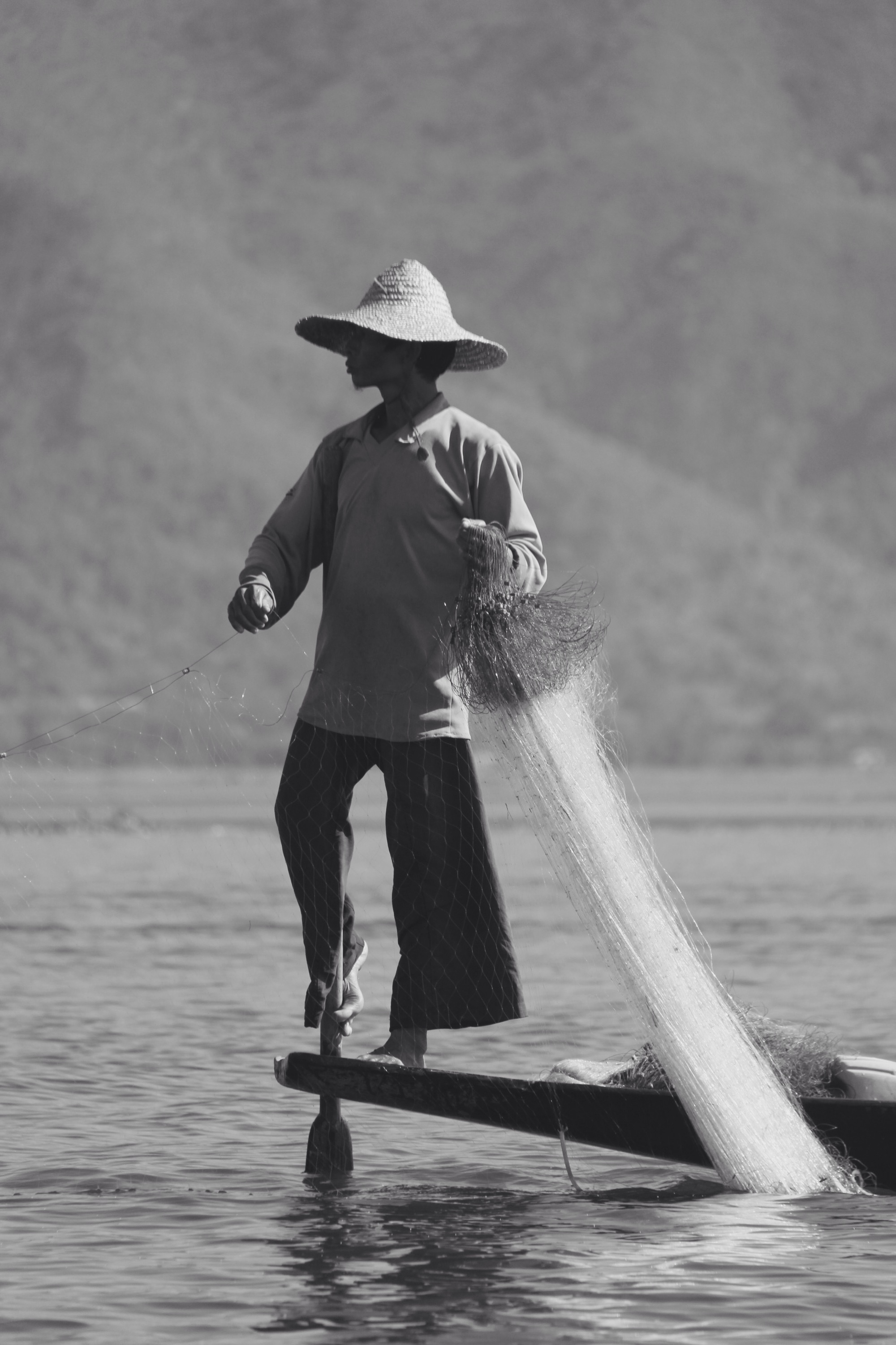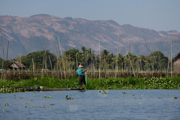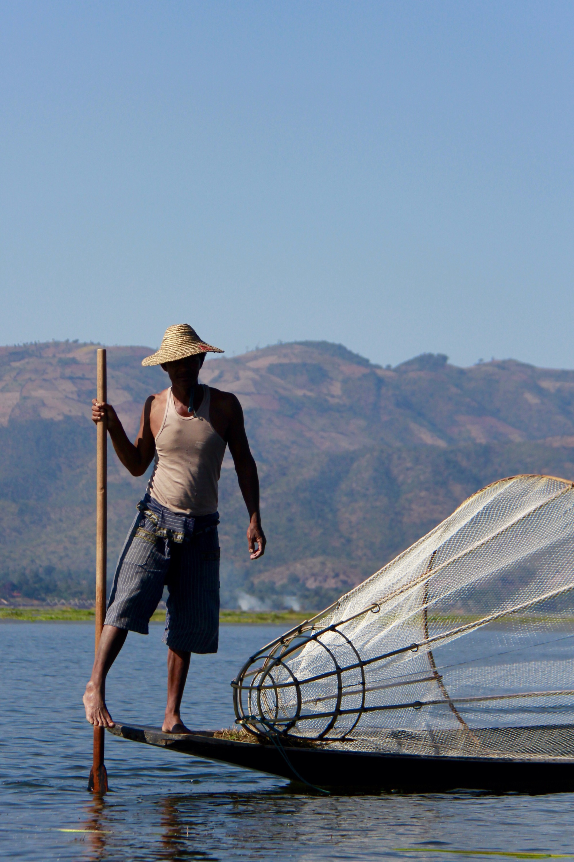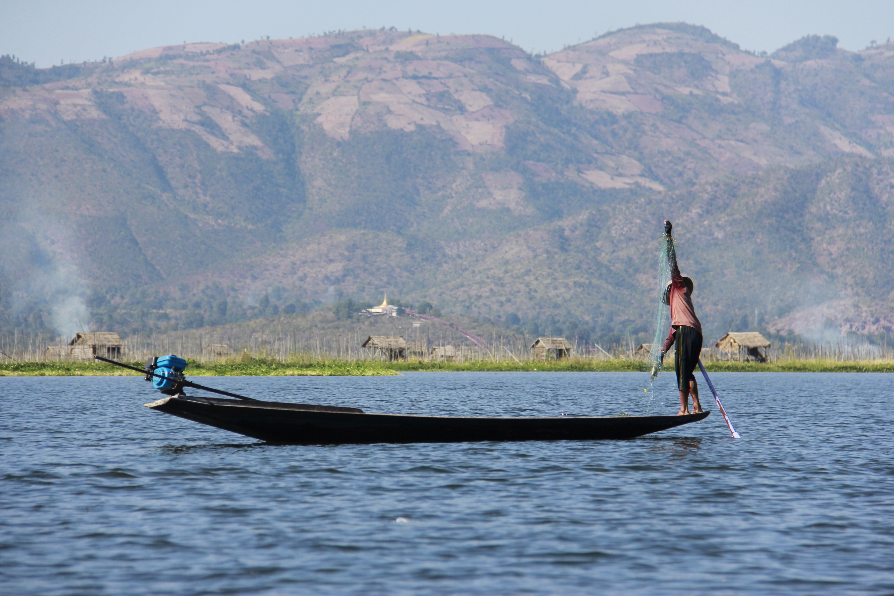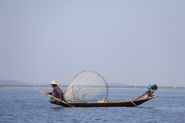 The last part of the trek is actually a boat trip to the lake Inle. Fisherman are staying stable on these long boats and are fishing with what it looks like… Their feet.