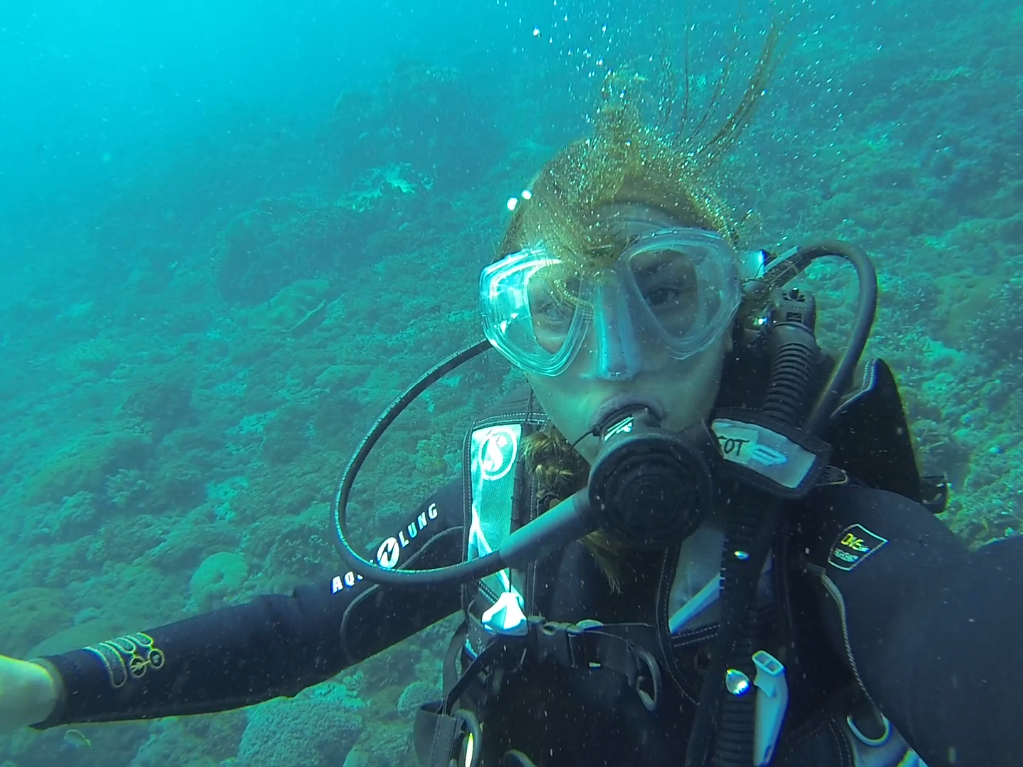 Equipment on. Buddy check: tight swimsuit on, BC on, palms on, mask on, everything is working and ready to keep me alive under the water.