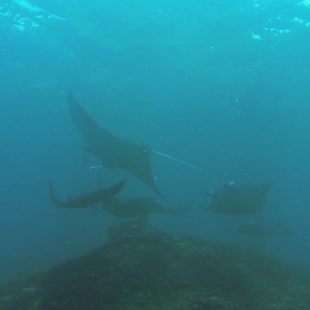 I found the perfect buyouncy. I am floating now in the middle of what I feel like nowhere. We slowly go north to be next to the “cleaning station”: a rock where Mantas and fish cleaners meet. Few shadows appears four meters away and announce the start of uncontrollable shivers of happiness that I will have from now on until the end of the dive They are twelve, gently flapping their wings, turning around a rock erected like a vivid and sacred totem.