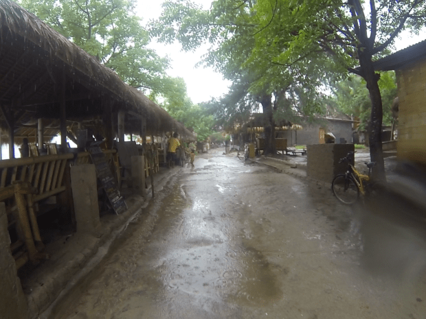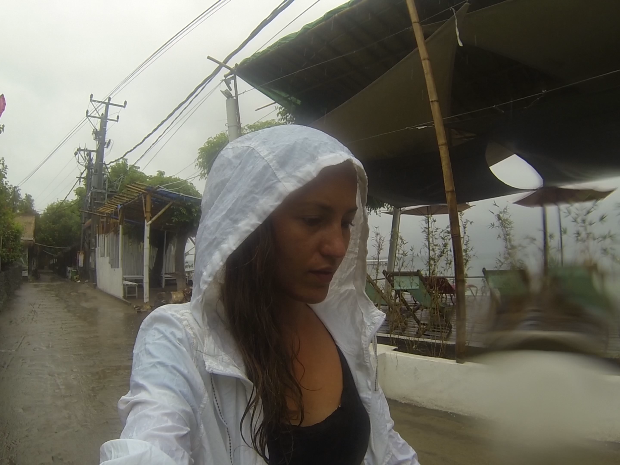 The very next morning, I planned to cross the island by foot (no worries it’s 10 minutes of walk) to go scuba diving with Sylvain. But it’s raining. it’s raining so much that the sandy path are filled up with water and I have to walk in pools (not even puddles).